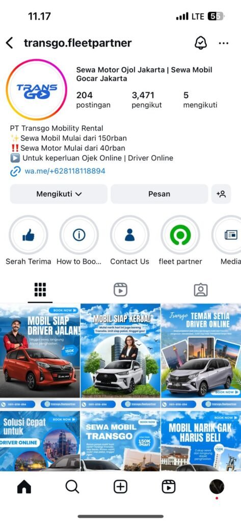 Nikmati kemudahan sewa motor listrik dan mobil berbagai pilihan untuk ojek online dan driver online hanya di PT. Transgo Mobility Rental! Tanpa jaminan atau deposit besar – cukup booking dalam 1 menit dan langsung jalan. Proses cepat, layanan buka 24 jam, siap mendukung mobilitas harian Anda di dalam maupun luar kota Jakarta. Cocok untuk keperluan harian, narik orderan, atau kejar target insentif. Layanan kami sangat ideal bagi driver Gojek, Gocar, GrabCar, InDrive, maupun Maxim yang membutuhkan unit siap pakai dan efisien. Gunakan unit lepas kunci dari kami – hemat waktu, efisien biaya, dan didukung tim profesional sepanjang perjalanan!
